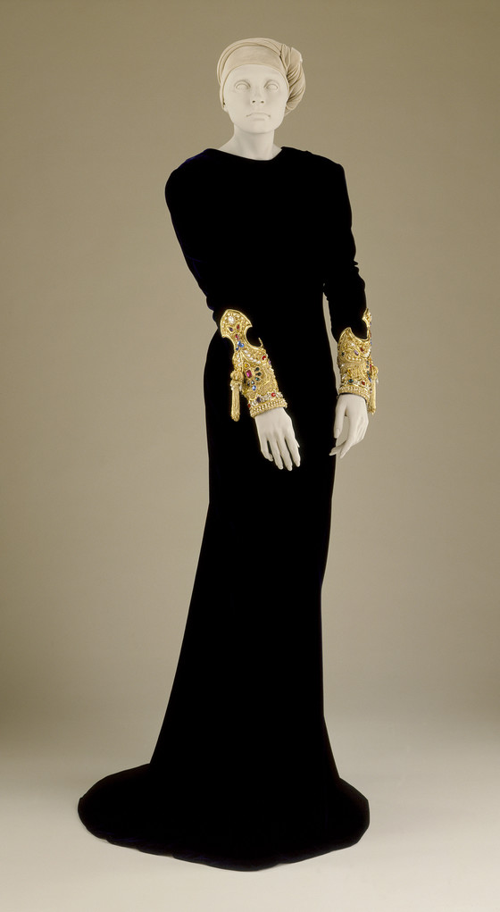 Silk velvet, metallic-plastic strip, metallic wrapped thread, glass bead, faux pearl embroidery, with prong set chrystals.