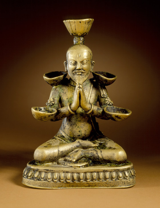 Ritual oil lamps have long been used in South Asia for Hindu and Buddhist religious ceremonies and social rites for weddings, birthdays, and death observances. They are typically made of brass and burn mustard oil in small burner dishes used to contain the oil and a floating wick. Nepalese figural oil lamps are often cast in the form of donors, such as two examples in the UCLA Fowler Museum of Cultural History, Los Angeles (X2001.11.101 and X2001.11.103). They can also be adorned with the deities invoked in the ritual (see M.2011.136).