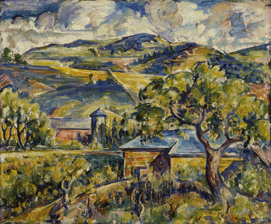 Although best known for his urban images, Dickinson did paint landscapes, and in the late 1910s he began a series of watercolors and drawings of houses and mountains that was inspired by paintings of Mont Sainte-Victoire by Paul Cézanne (1839-1906). In these paintings Dickinson presented the buildings and terrain as a series of angular planes compressed in space. Maine Landscape is not as cubist as his other landscapes. The artist seems to have reveled in the circular movement of the tree form. His vigorous handling of the tree is carried through the entire painting, with thick strokes applied in an almost explosive manner. While perhaps revealing the early influence of Chase, the brushwork and vibrant, nonrepresentational color are indebted to fauvism. Indeed, these Cézannesque landscapes are the most expressive Dickinson ever painted.