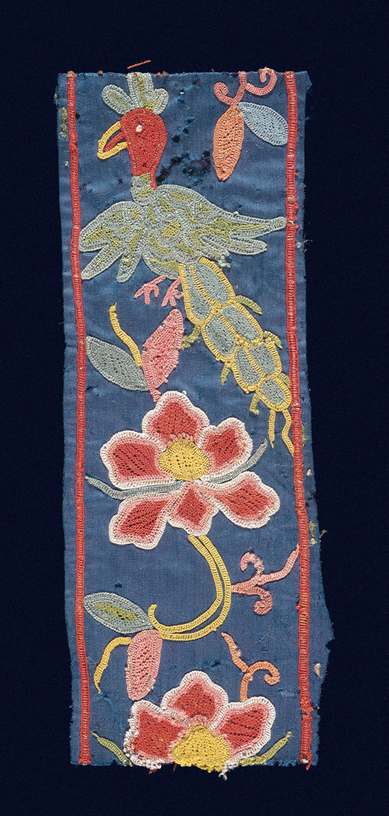 Silk satin with silk needleloop embroidery and gilt paper strip