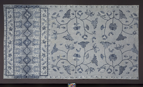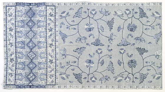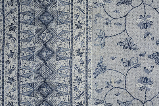 The Chinese pattern on this batik consists of two stylized kembang teratai (flowering lotus trees), mirrored along an imaginary horizontal line. Although the subject is Chinese, the design itself shows the influence of art nouveau. A single standing bird marks the center of the badan. The robust quality of the filler motifs indicates Cirebon influence. The background is decorated with banji in traditional Pasisir style. The triangles in the complex, Peranakan-style kepala gigi balang, are alternately long and short, while the central area is dominated by a row of diamonds on a ground of double diagonals. Each is adorned with an abstract pattern or a bird in classic Pasisir style. The papan and ¬ borders also show classic Pasisir motifs. Flowering vines, long-tailed birds, and rice stalks fill the available space. The style of the motifs in the borders is unusual, while the seret shows a new development, greater space between the vertical lines. Two shades of blue on white make up a perfectly ¬ executed kelengan.