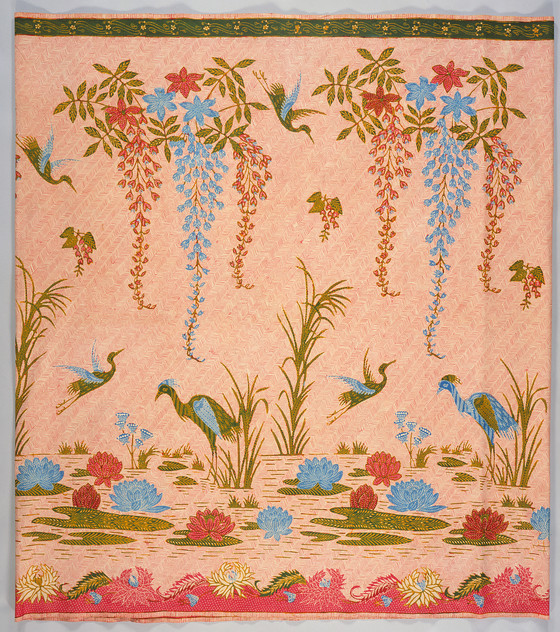 Hand-drawn wax resist (batik) on machine-woven cotton, synthetic dyes, stamped signature
