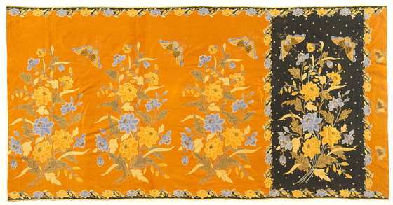 Hand-drawn wax resist (batik) on machine-woven cotton, synthetic dyes, waxed signature