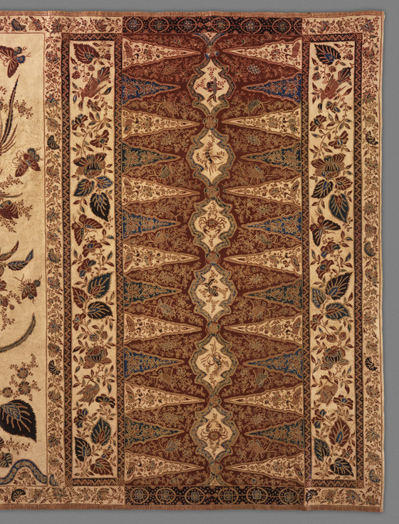 Large egrets perched among the branches of the tree of life mirror each other across the badan. Some of the large leaves are depicted in a European, three-dimensional manner. Floral sprigs decorate the intervening spaces. The kepala shows a baroque treatment of the diamond outlines: “Europeanized,” lengthened, and each enclosing a water creature, which is, however, depicted in Pasisir style. The tumpal rows are filled with small trees on alternately cream and green backgrounds. The red base of the kepala is elaborately decorated. The badan shows red, blue, yellow, the famous Von Franquemont green, and black on a cream ground and has a refined application of gold dust. A European interpretation has been given to the traditional Pasisir lower border.