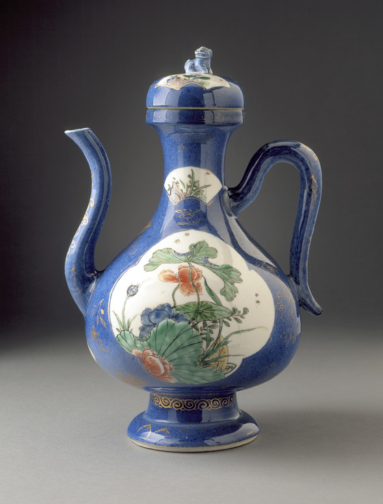 Wheel-thrown porcelain with powder blue glaze, overglaze painted enamel decoration (wucai), and gilding