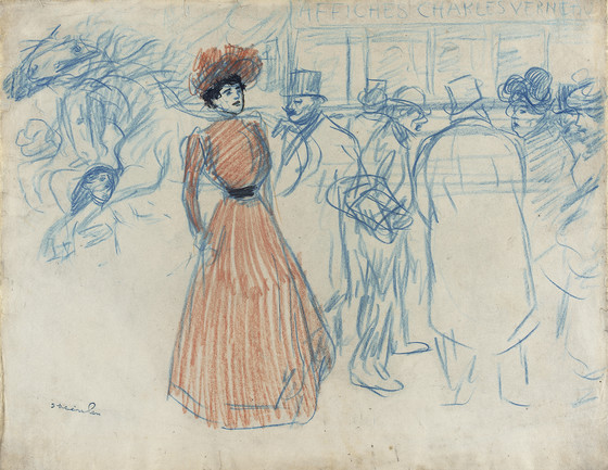 Blue and red pencil, black ink, and watercolor