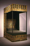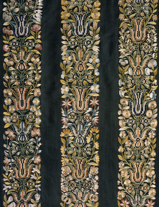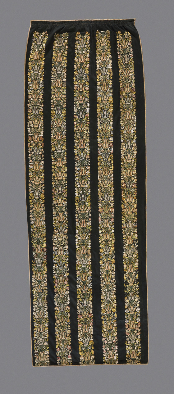 Wool twill with silk embroidery, linen appliqué with silk embroidery, and silk fringe