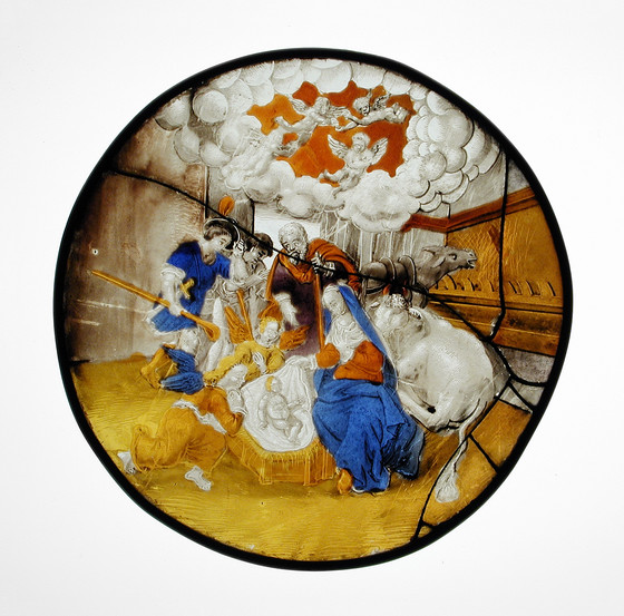 Reamy white glass; two hues of silver stain; two shades of vitreous pint; translucent enamel; back-painting
