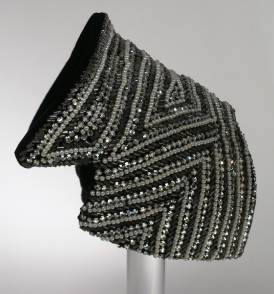 Beads, faux pearls, rhinestones, velveteen