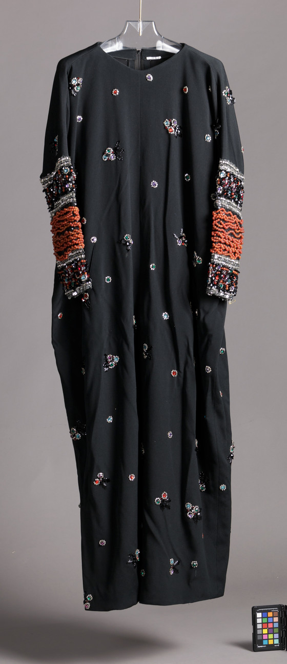 Silk plain weave (crepe) with glass and plastic beads, paste stones, sequins, and crystals