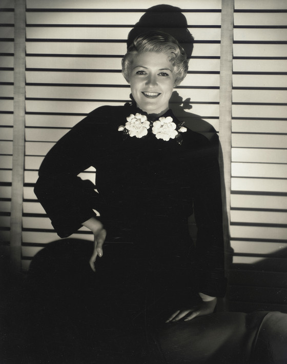 Descriptive: [standing, black dress with 2 gardenias, against blinds)