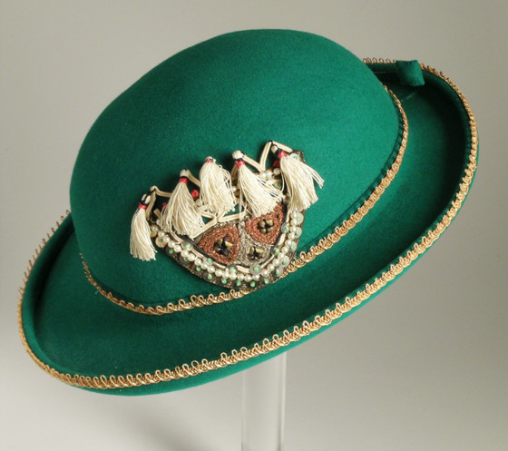 .1) Hat: Wool felt, straw braid, sequins, faux pearls, silk embroidery, foil-wrapped yarn; .2-.3) Hat pins: wool felt, steel