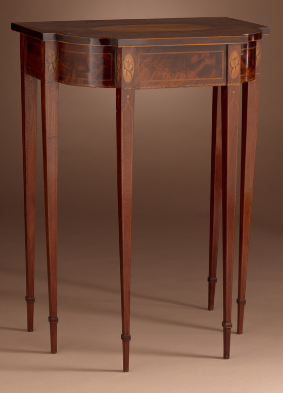 Mahogany, pine woods, various inlays, ovolo corners, six legs