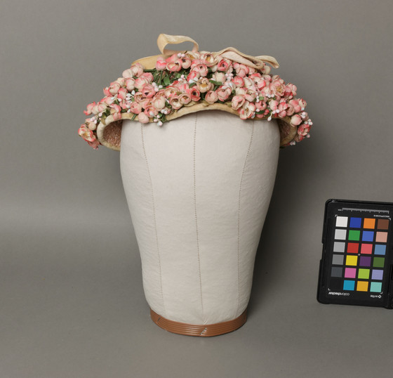 Cellophane wrapped straw, fabric flowers, velvet ribbon