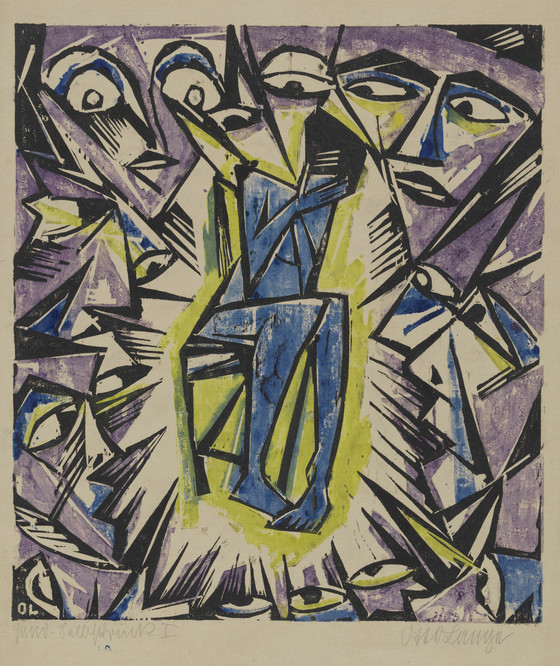 Woodcut and color monotype printed in green, blue, purple and black on heavy wove paper
