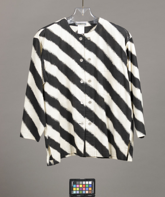 Cotton plain weave, warp-and weft-printed (ikat), metal buttons