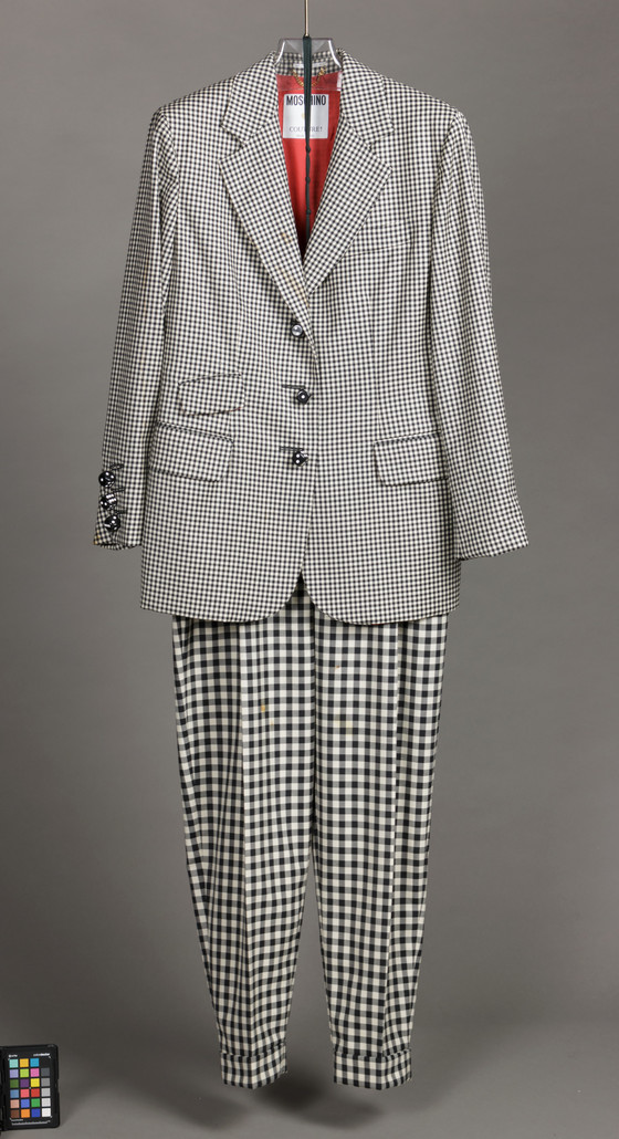 Jacket: wool twill with plastic dice buttons; Pants: wool twill