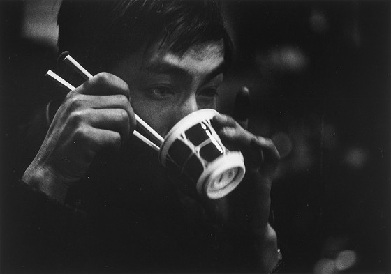 Descriptive: [man with bowl and chopsticks]
