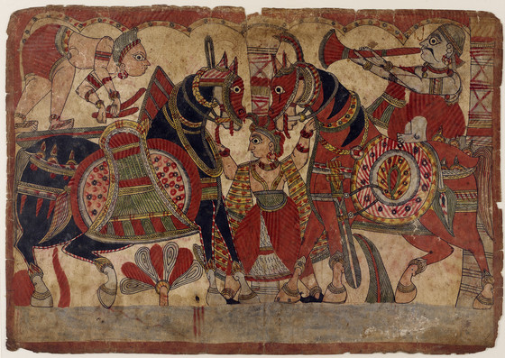 Drummer and Horn Player (Accompanying the Hunt?), Scene from the Story of the Marriage of Abhimanyu and Vatsala, Folio from a Mahabharata ([War of the] Great Bharatas)