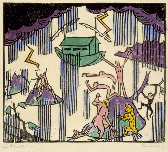 Woodcut with blue, purple, green, yellow and pink watercolor on thin Japan paper