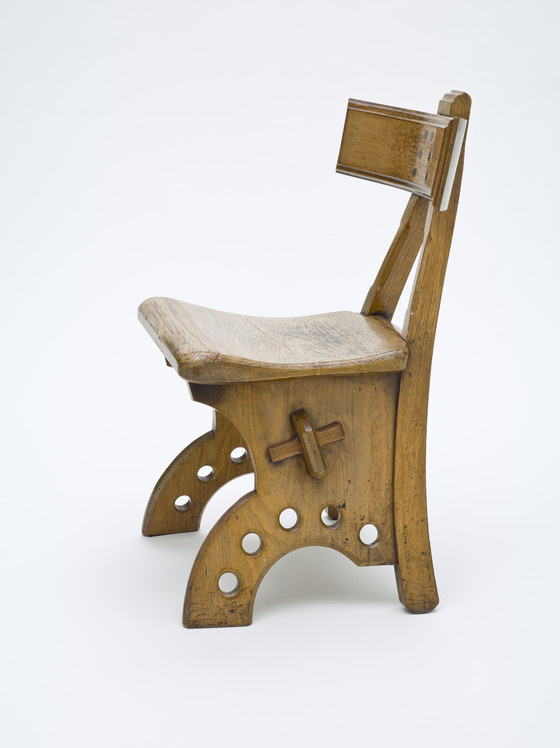 Designed by Edward Welby Pugin (1834-1875), this oak chair exhibits the structural honesty and truth to materials central to British Arts and Crafts philosophy. The eldest son of Augustus Welby Northmore Pugin, the first and most important standard bearer for the moral aesthetics of the Gothic Revival, E.W. Pugin worked in the style that A.W.N. had popularized, assisting in his father’s shop from a young age. When the senior Pugin died in 1852, the 18-year-old Edward took over the studio and unfinished commissions.