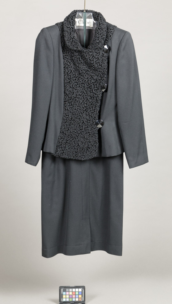 Wool twill (gabardine) and wool astrakhan fabric with plastic buttons