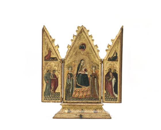 Triptych with the Enthroned Virgin between Saint Catherine of Alexandria and Saint Lucy (central panel); Saint Francis, Saint John the Baptist, and the Archangel Gabriel (left wing); Saint Bartholomew, Saint Dominic, and the Virgin Annunciate ( right wing