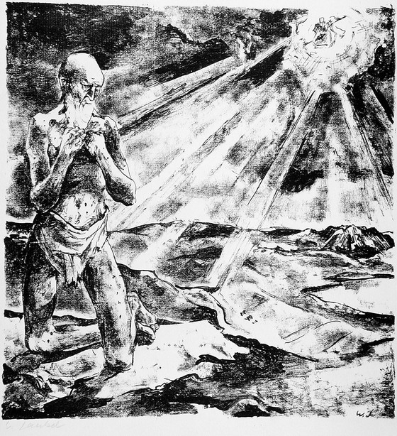 Descriptive: (Job kneeling in landscape)