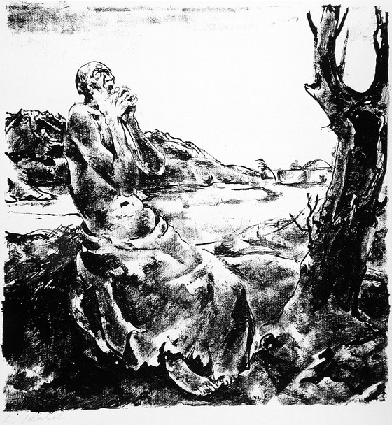 Descriptive: (Job kneeling in landscape)