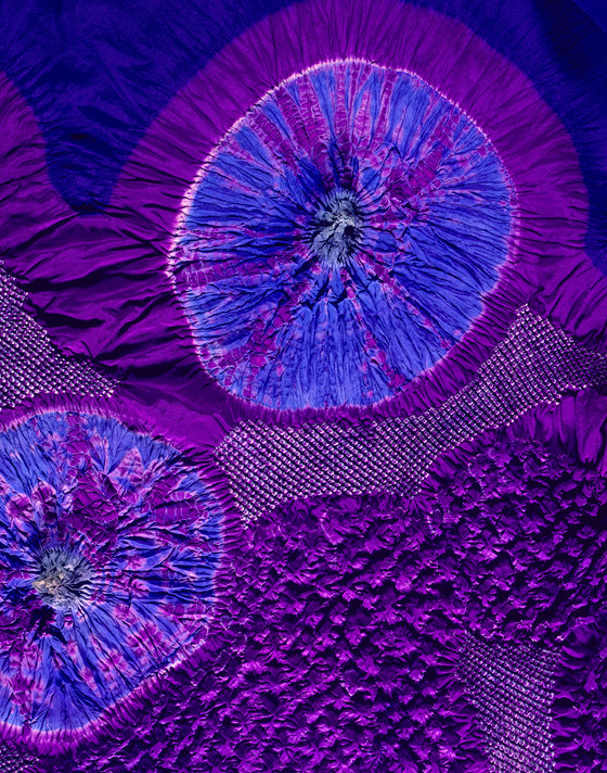 .1) Kimono Coat: Silk plain weave (crepe), silk plain weave with resist tie-dyeing (shibori)