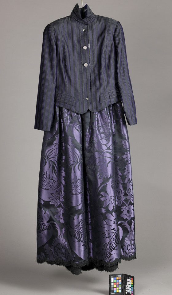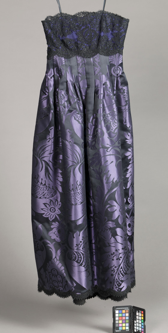 Dress: Silk damask, silk machine-made lace, silk net; Jacket: Silk twill with supplementary warp patterning, mother-of-pearl buttons