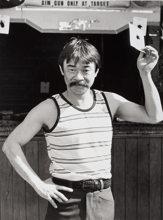 Descriptive: [Asian man holding target]