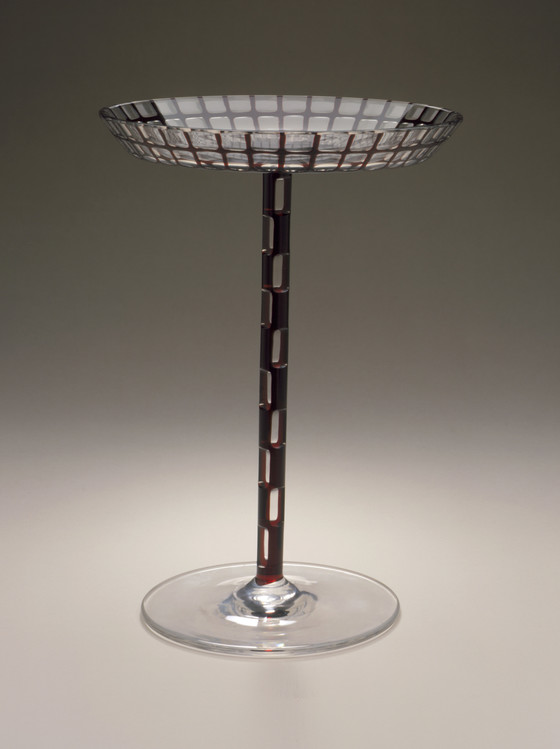 Burgundy red glass overlay on clear glass, wheel-cut geometric design