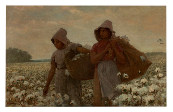 Traditionally Winslow Homer has been cast as a shy loner, working in relative isolation. However, his paintings from the Civil War to 1880 were anything but devoid of social content. The group of paintings of African Americans that he produced in the 1870s, of which The Cotton Pickers is the most important, resonate with political meaning. Homer was the first American consistently to paint African Americans without the prevailing attitudes of condescension and sentimentality. The date of this painting sheds light on its significance. Not only was 1876 the year of the country’s Centennial: more importantly for blacks it also marked the end of Reconstruction, as federal troops withdrew from the south. The Reconstruction era had been buoyed by hopes that the situation of former slaves would be drastically improved as they were freed and educated. Unfortunately that idealism was to be short-lived, as racism and bigotry emerged with vehemence. Homer still evinces the earlier hopefulness in his commanding painting of two female field laborers. His portrayal is sympathetic and positive: they are not being over or fatigued but rather stand erect, their strong bodies monumentalized against the sky. The woman on the right looks far into the distance, dreaming of a better future.