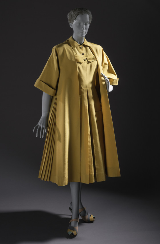 Dress: silk/wool plain weave (faille), metal and plastic rhinestone buttons. Coat: silk/wool plain weave (faille).