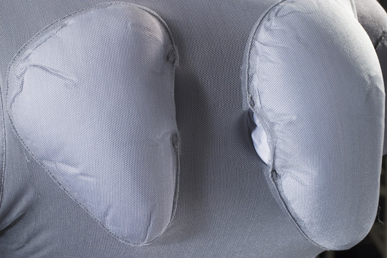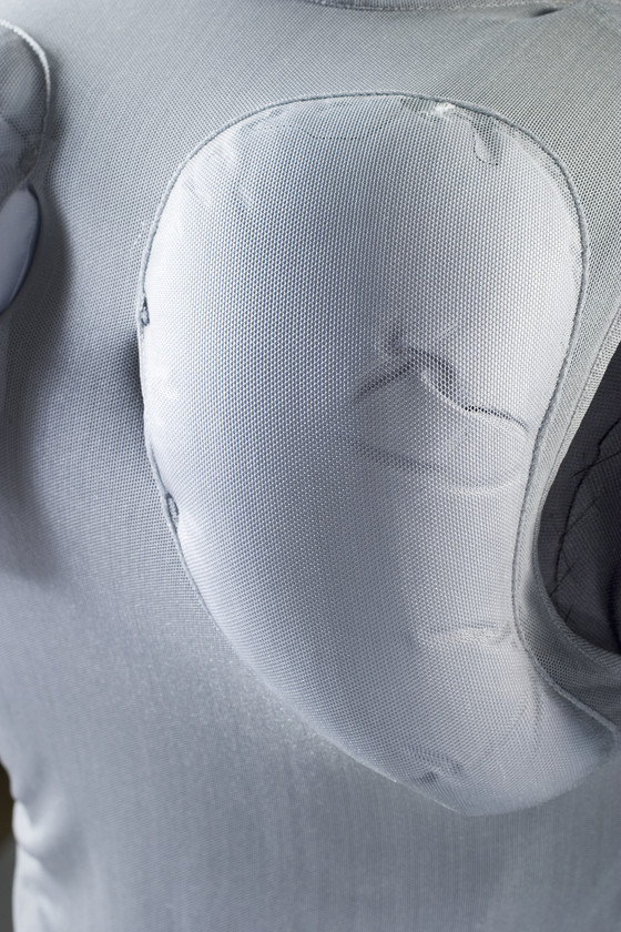 Overdress: Crimped polyester plain weave; underdress: nylon net; inserts: polyurethane plain weave with feather and down fill