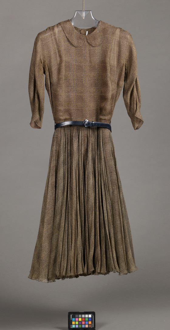 Dress: silk plain weave (chiffon), printed; Belt: leather