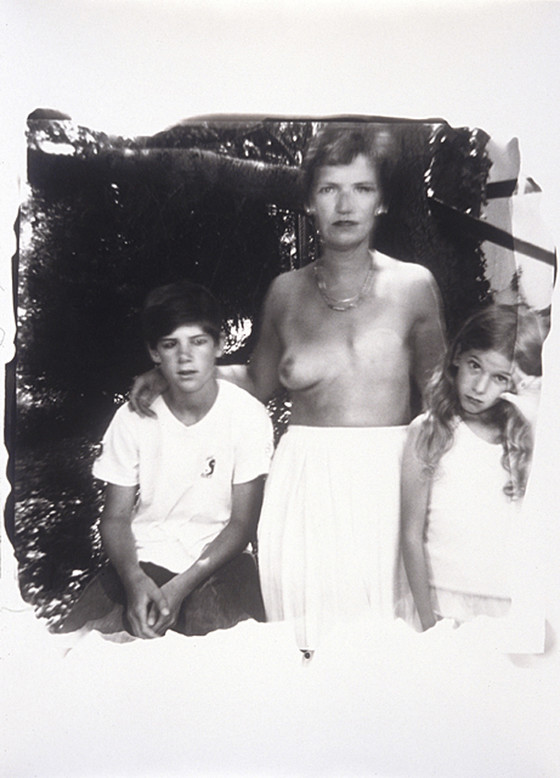 Descriptive: (topless self-portrait w/ 2 kids)