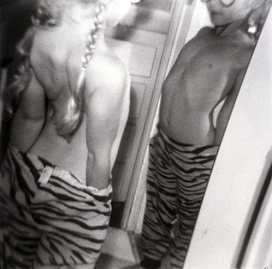 Descriptive: (girl, leopard pants, mirror)