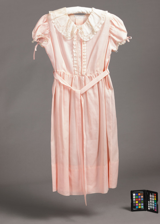 Cotton plain weave (dimity) with cotton plain weave, cotton lace, and mother of pearl buttons