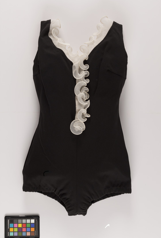 .Jacket: nylon knit, nylon plain weave (chiffon), with heat set pleats; Swimsuit: nylon knit, nylon plain weave (chiffon) with heat set pleats