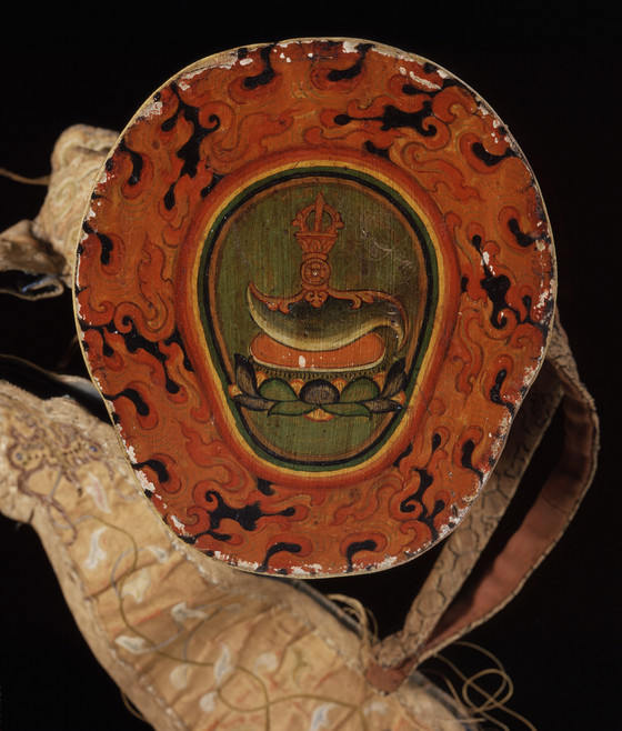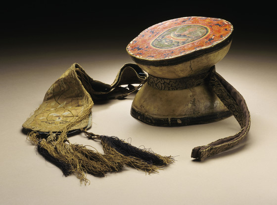 Human skulls, animal skin with mineral pigments; embroidered silk fittings