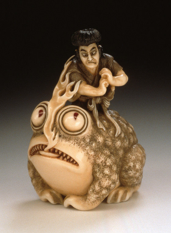 Ivory with staining, sumi, hornbill inlays, red pigment