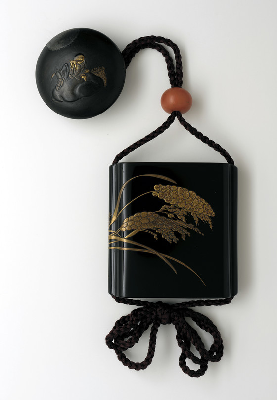Inrō: 2 9/16 x 2 7/16 x 5/8 in. (6.4 x 6.1 x 1.5 cm); Ojime: 7/16 x 5/8 in. (1.1 x 1.5 cm); Netsuke: Diameter: 1 3/4 x 11/16 in. (4.3 x 1.7 cm)