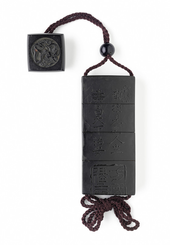 Inrō: black lacquer on substrate; Ojime: black hardstone or glass; Netsuke: ebony; manjū type
