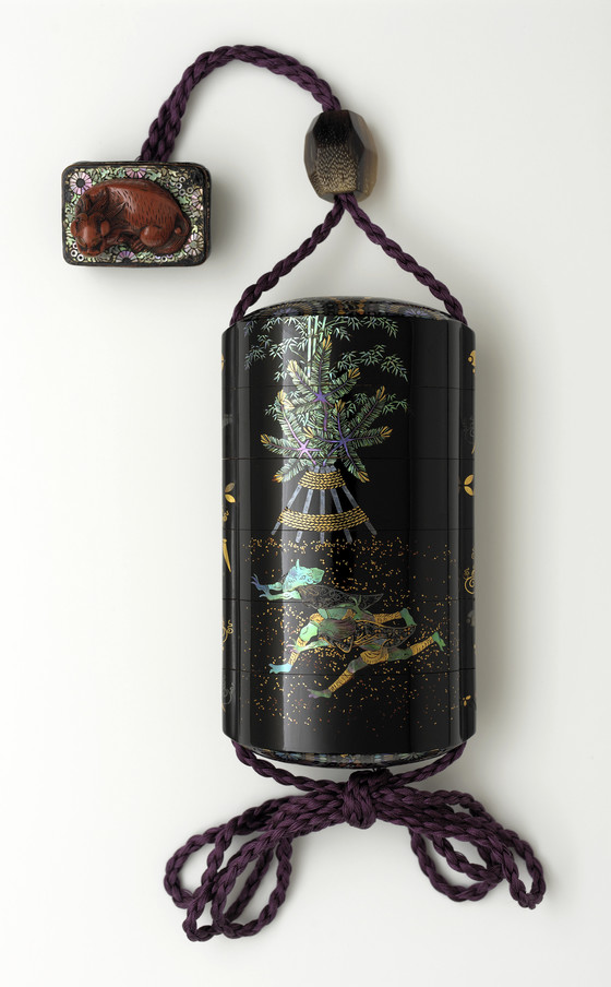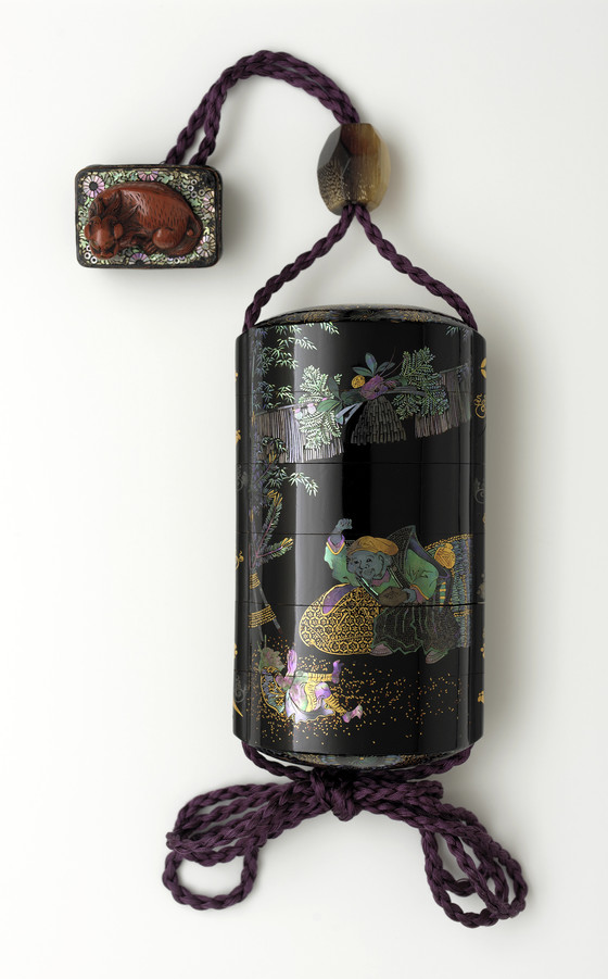 Inrō: lacquer on substrate, sprinkled gold flecks, inlaid mother-of-pearl; Ojime: buffalo horn; Netsuke: vermilion and black lacquer on wood with mother-of-pearl inlay