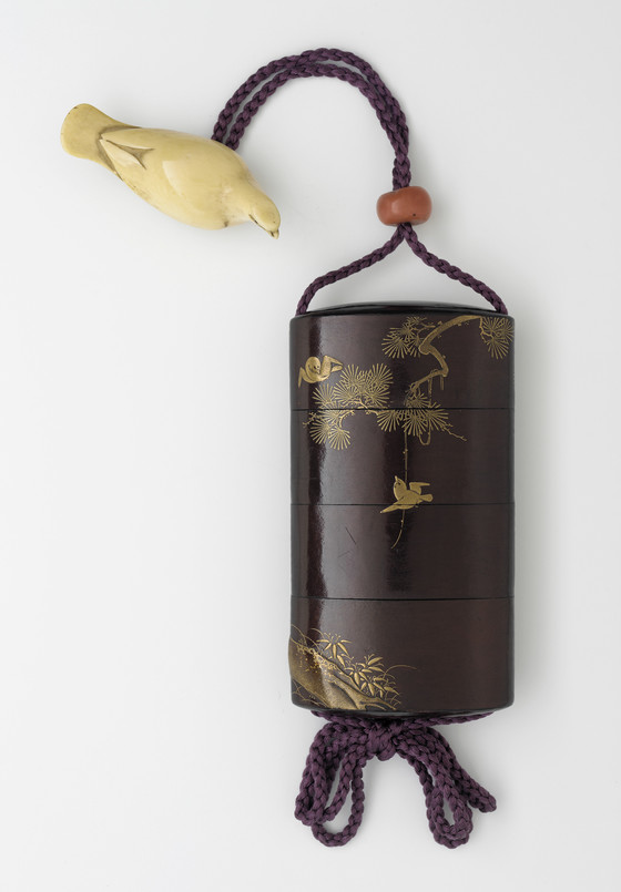 Inrō: lacquer on cherry bark, mixed metal flecks; Ojime: coral; Netsuke: ivory