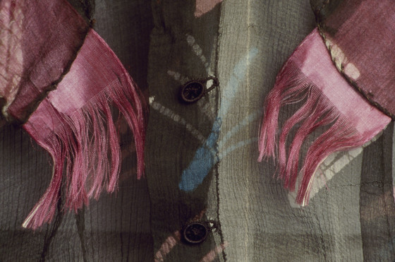 Silk plain weave (chiffon), wax-resist dyed (batik) with silk satin ribbon trim