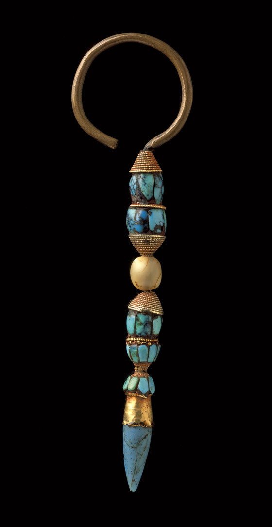 Gold, turquoise, colored quartz, glass and brass