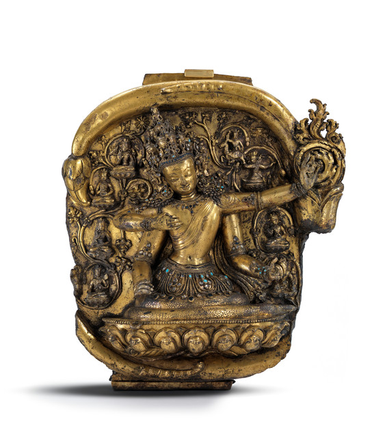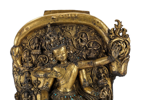 Gilt copper alloy inlaid with colored glass ornaments
